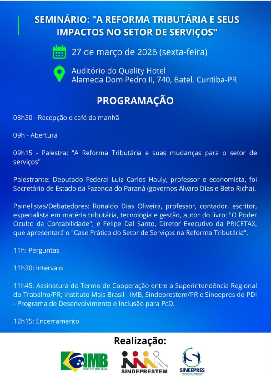O Instituto Mais Brasil IMB; SINDEPRESTEM – PR e o SINEEPRES, tem a satisfação em convidá-lo (a) para participar da palestra “ A Reforma Tributária e seus Impactos no Setor de serviços “, tendo como palestrante o Deputado Federal Luiz Carlos Hauly ( Podemos/PR ) e como painelista os professores tributaristas Ronaldo Dias Oliveira e Felipe Dal Santos.